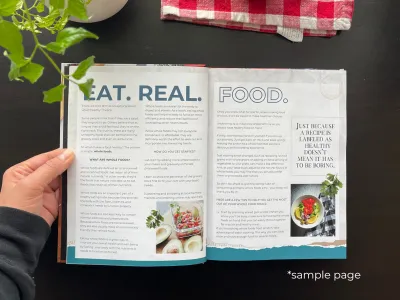 Your Guidebook brings everything together: pantry swaps, meal-building formulas, recipe templates, and a full whole foods reference.